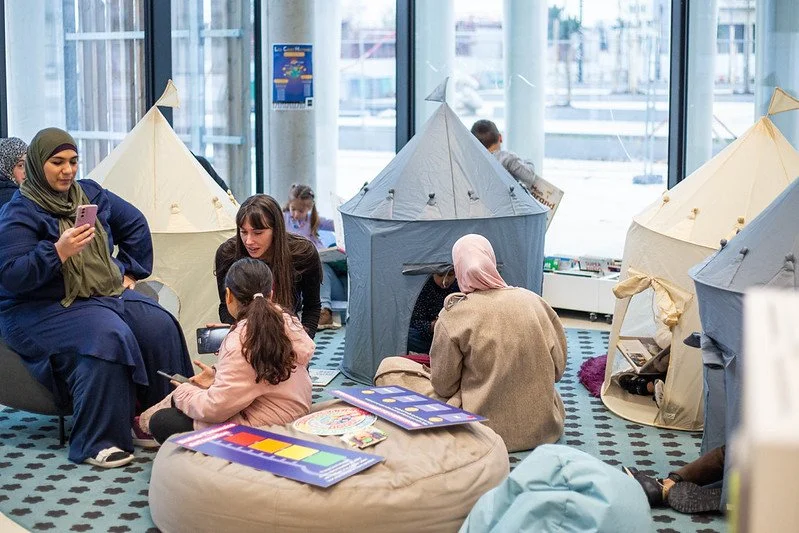 Reconnaître ce que ressent l'autre, mettre des mots sur des expressions du visage ou des gestes : c'est une compétence qui s'apprend. Cet atelier propose un village de quatre cabanes, chacune dédiée à une émotion : la joie, la tristesse, la colère et la peur. À l'intérieur, un court montage vidéo présente des personnages de dessins animés qui expriment une émotion par leur visage ou leurs gestes. L'émotion n'est pas affichée à l'entrée : c'est à l'enfant de la découvrir. Un tapis central fait office de place du village, espace d’échange et de découverte d’outils pour parler des émotions entre parent et enfant.