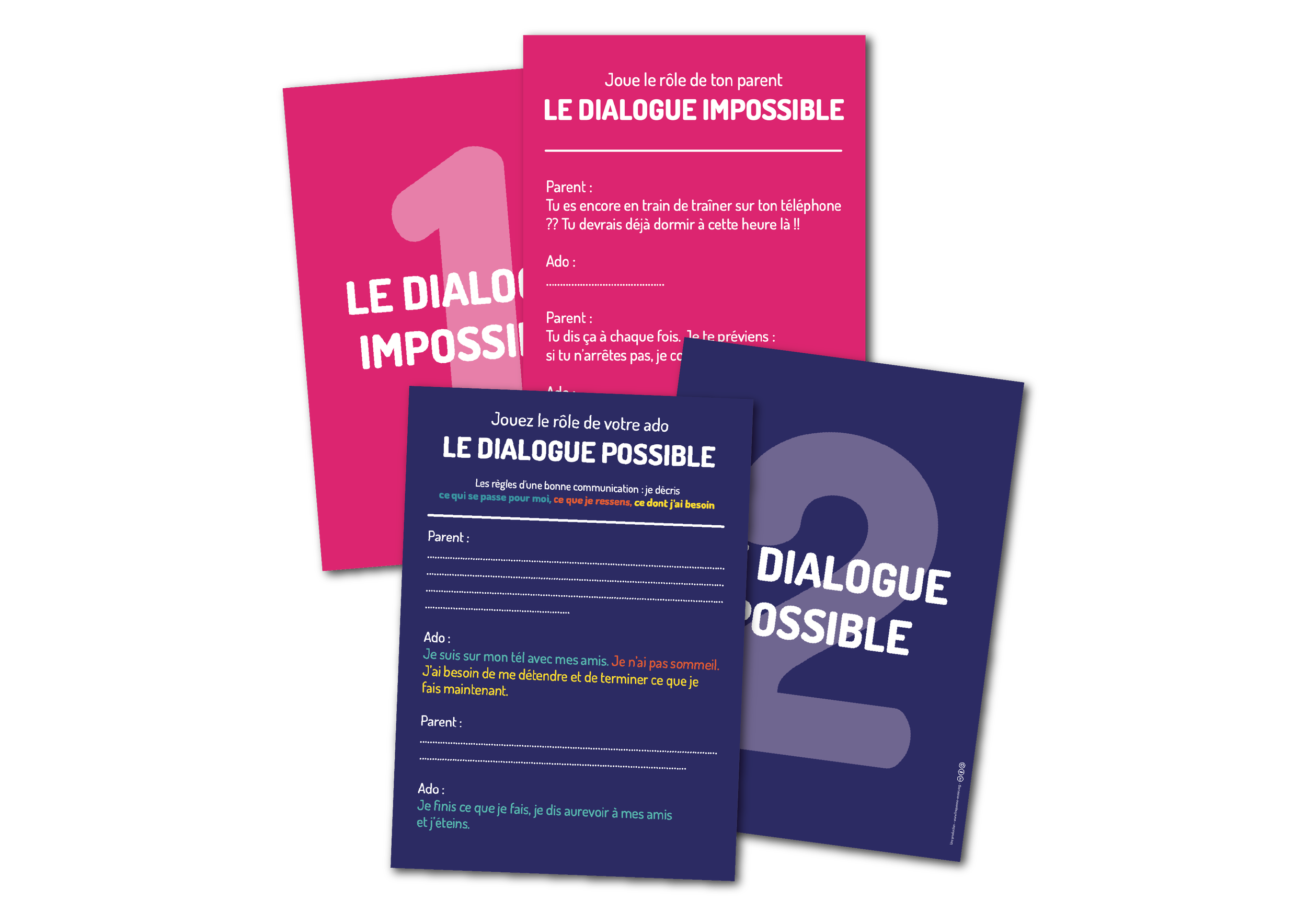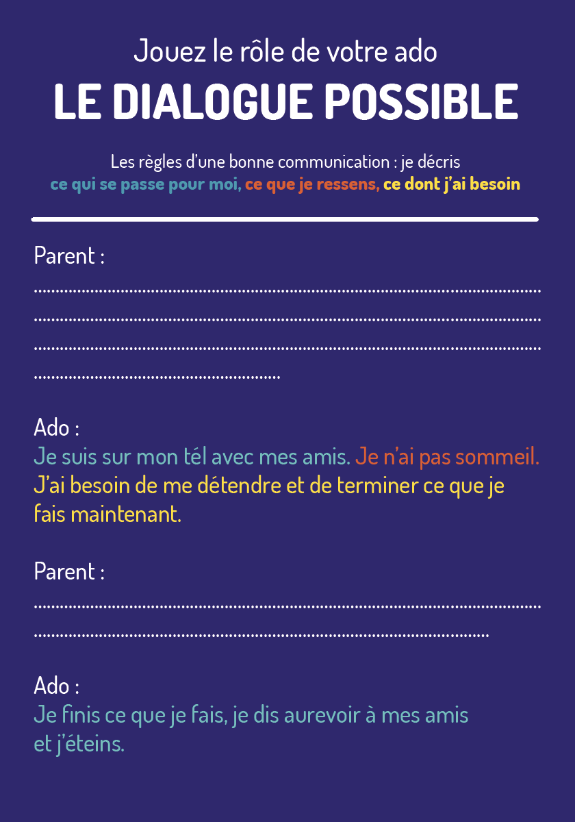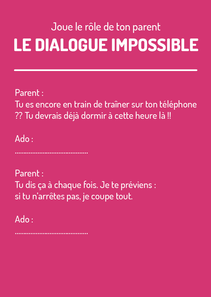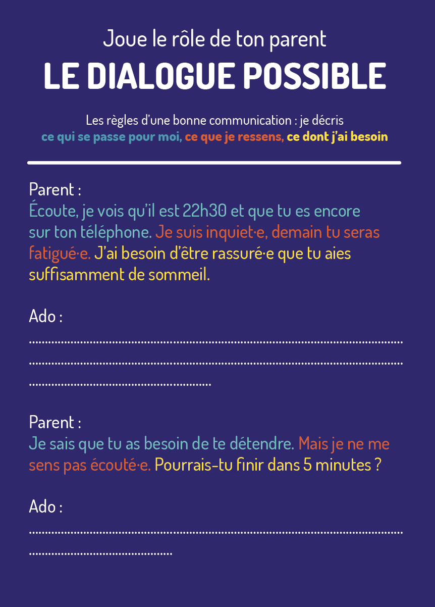 L'ado joue le parent et le parent joue l'ado. Ils lisent d'abord à voix haute un "dialogue impossible" caricatural, reconnaissable, puis un "dialogue possible", qui montre concrètement ce que ça donne quand la communication fonctionne.